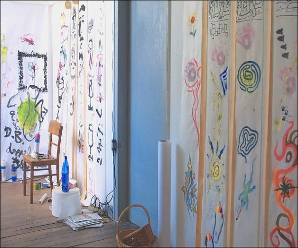 Inszenierung im Raum für experimentelle Kunst. Malerei, Material- und Klangcollage.